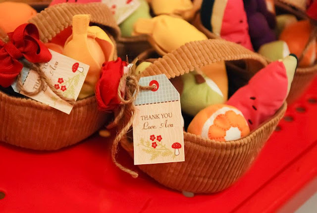 party favors were cleverly picked out to match the theme. the boys took home felt wolf masks which are adorable. the girls get to take home felt fruit-filled baskets spruced up with a fabric flower made by her friend. such a personal touch!